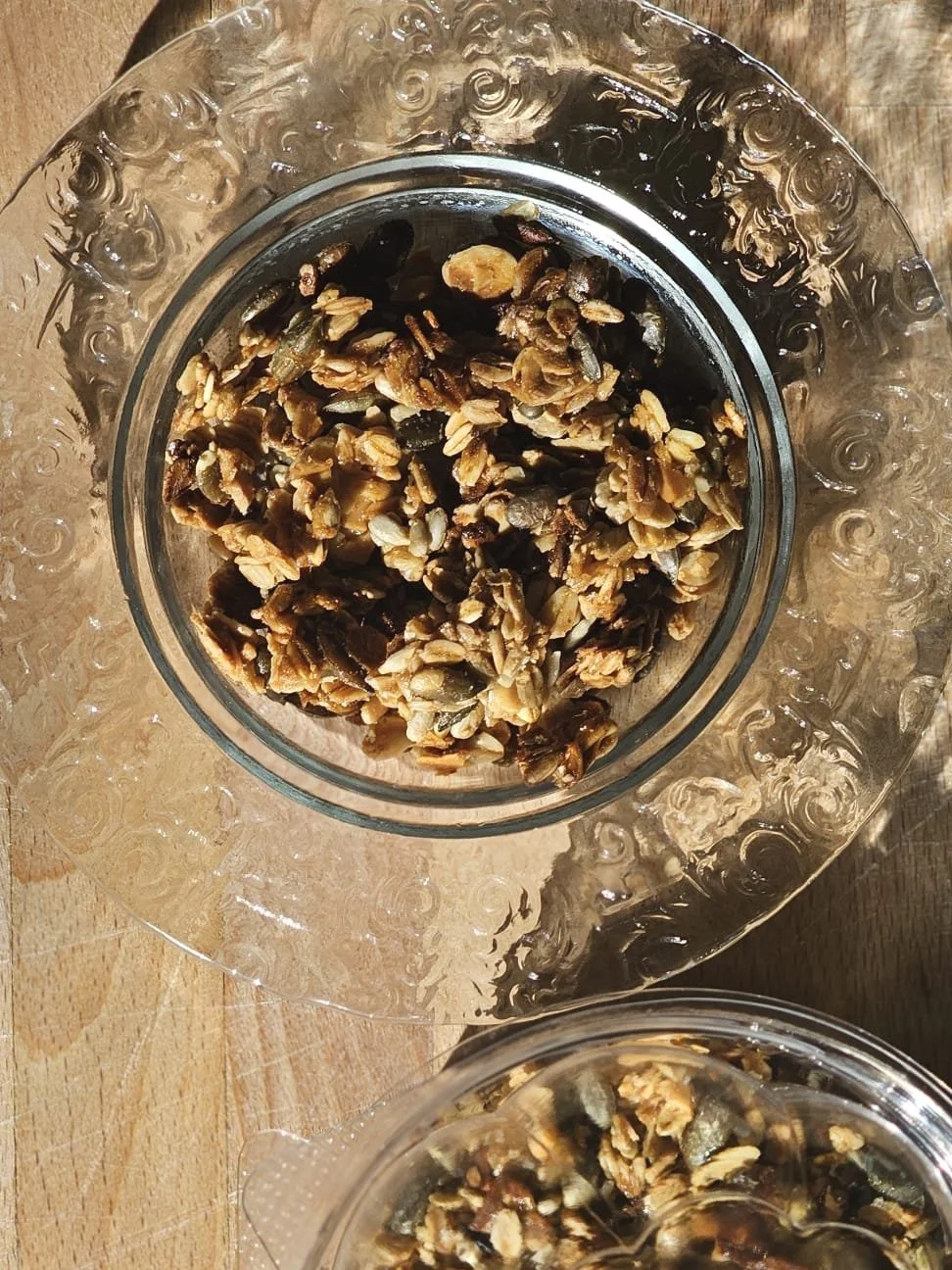 גרנולה “רגילה” עם הפתעות של בננה, חמוציות, פולי קקאו וקוקוס קלוי